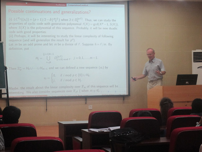 报告中,Vladimir Edemskiy教授首先介绍了序列的线性递归关系、生成多项式、极小多项式等基本概念以及计算序列线性复杂度的多种方法;其次介绍了经典分圆序列的定义以及相关知识。最后分享了关于广义分圆序列线性复杂度研究进展的见解。