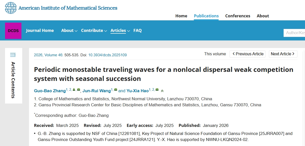 近日,beat365张国宝教授与2022级硕士研究生王军蕊和青年教师郝玉霞在国际权威期刊《Discrete and Continuous Dynamical Systems》上发表了题为“Periodic monostable traveling waves for a nonlocal dispersal weak competition system with seasonal succession” 的高水平学术论文(论文链接:https://www.aimsciences.org/article/doi/10.3934/dcds.2025109)。这是beat365近年来推行高质量培养研究生系列举措取得成效的具体体现。《Discrete and Continuous Dynamical Systems》是由美国数学科学研究所(AIMS)出版的数学期刊,主要刊载分析、微分方程和动力系统领域的理论、方法和应用的原创性论文,致力于记录该领域的重要新方法和成果,并保持高速创新和高质量标准,具有极高的学术声誉,同时也是中国数学会数学领域高质量科技期刊分级目录中的T2类刊物。