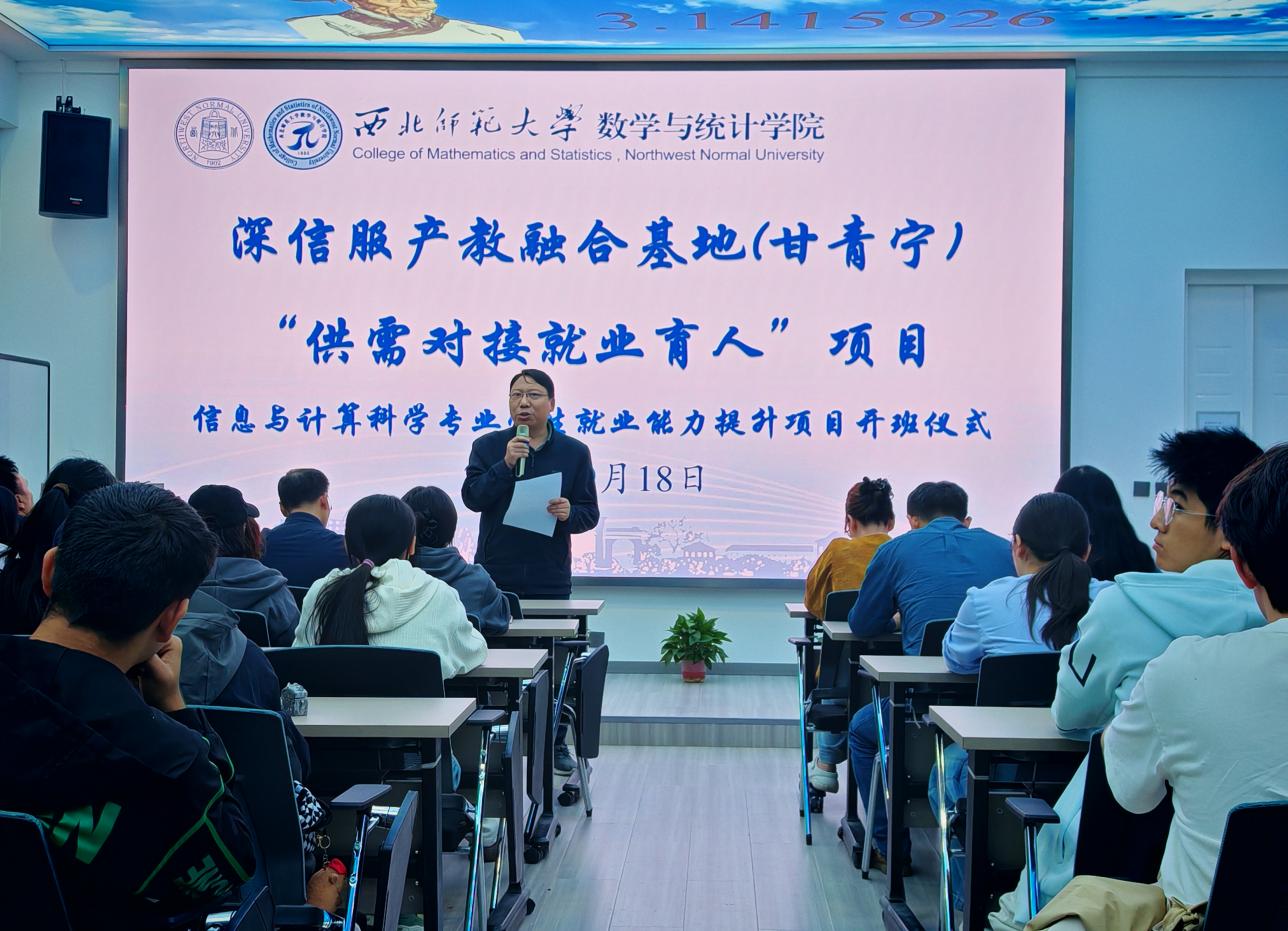 9月18日晚,学院与深信服产教融合基地(甘青宁)合作开展的“教育部供需对接就业育人”项目——信息与计算科学专业学生就业能力提升项目开班仪式在致勤楼D07报告厅举行。深信服西北大区产教融合业务总经理冯金凤、深信服产教融合基地产品经理刘思汝,学院副院长张国宝、党委副书记张向东、信计与统计系主任杨宏、专职辅导员包佳佳以及信息与计算科学专业学生参加。